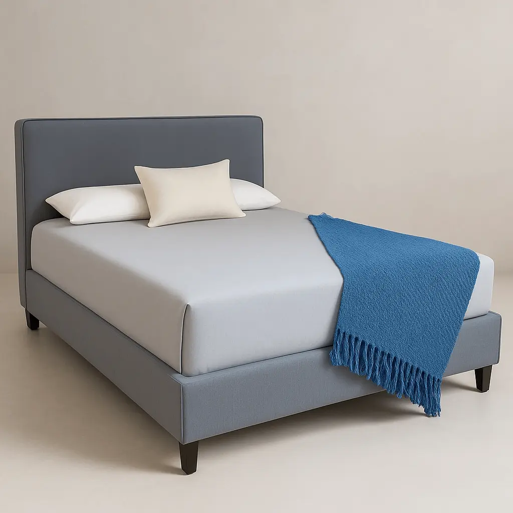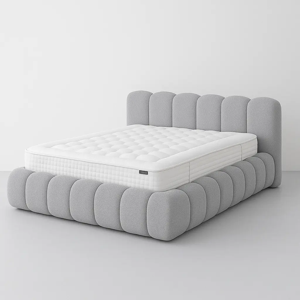Το διπλό κρεβάτι Panas συνδυάζει μοντέρνο σχεδιασμό με άνεση και κομψότητα. Διαθέτει ψηλό, επενδεδυμένο κεφαλάρι σε σκούρο γκρι ύφασμα που