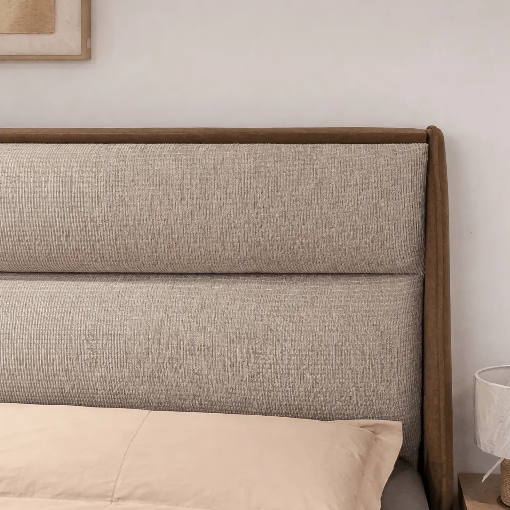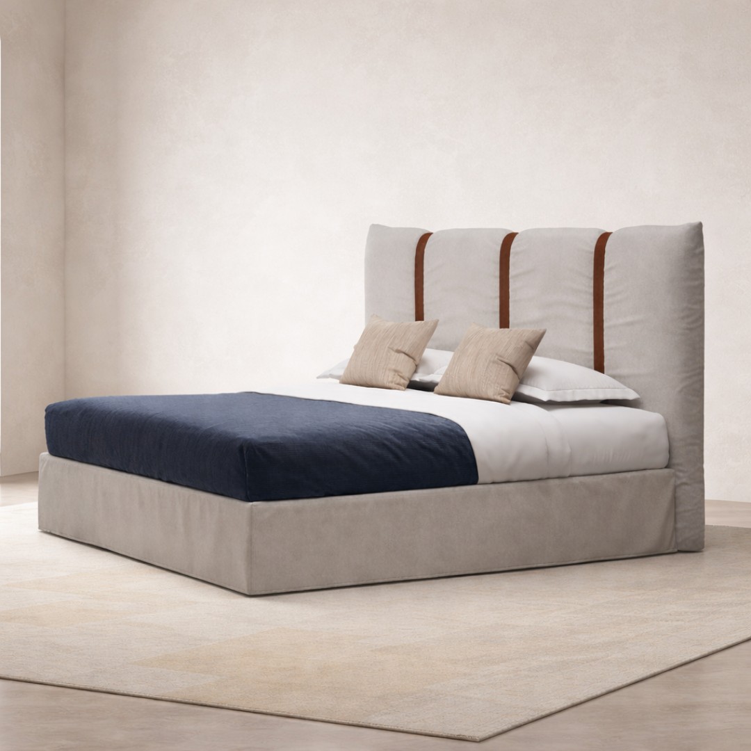 Το κρεβάτι διαθέτει έναν ψηλό, ορθογώνιο κεφαλάρι επενδεδυμένο με ένα κομψό, απαλό γκρι ύφασμα που φαίνεται να έχει μια διακριτική