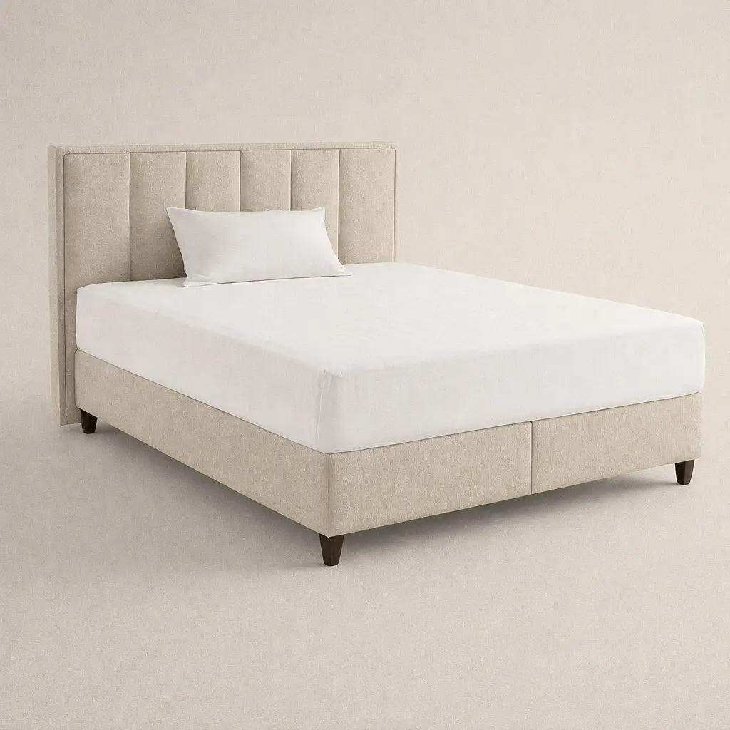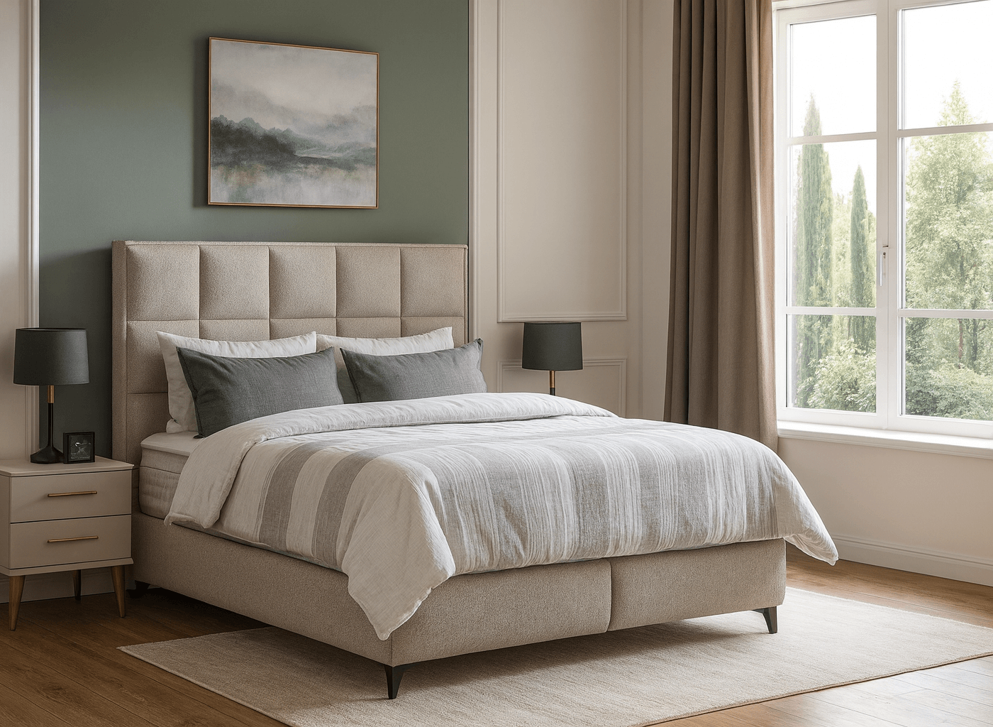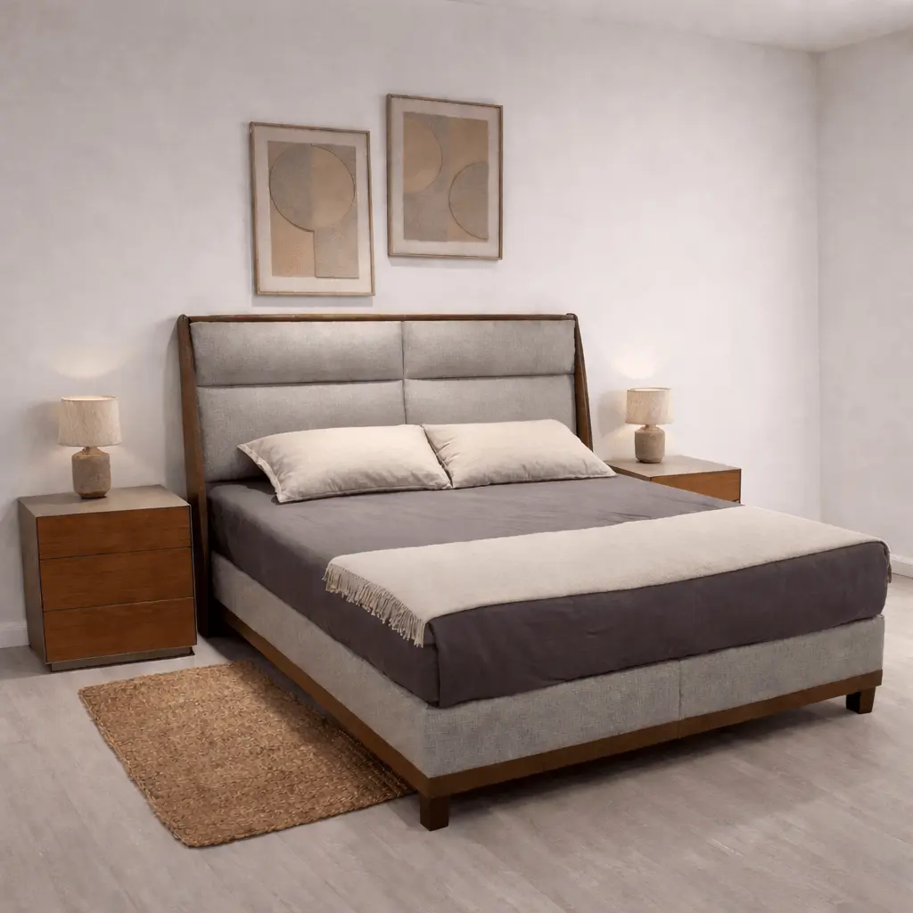 Το διπλό κρεβάτι Panas συνδυάζει μοντέρνο σχεδιασμό με άνεση και κομψότητα. Διαθέτει ψηλό, επενδεδυμένο κεφαλάρι σε σκούρο γκρι ύφασμα που
