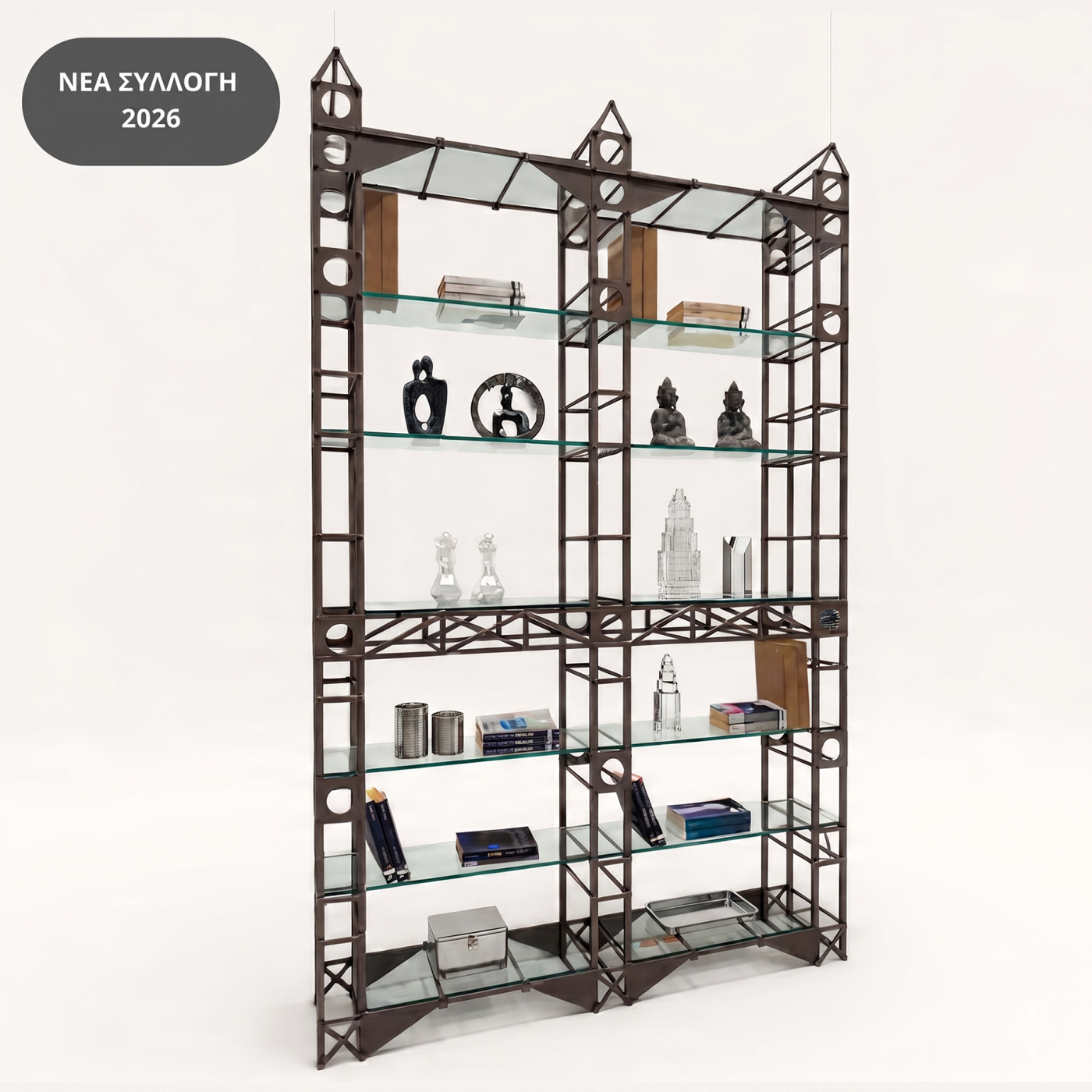 Μεταλλική βιβλιοθήκη σε industrial ύφος με λεπτομερή γεωμετρικό σχεδιασμό και μπρονζέ φινίρισμα. Η ιδιαίτερη κατασκευή της με μεταλλικό πλέγμα δημιουργεί