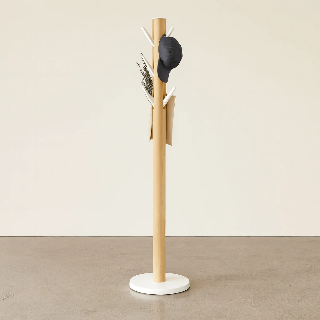 Η ξύλινη κρεμάστρα ρούχων είναι ψηλή και κομψή με εννέα γάντζους που αναδιπλώνονται, προσφέροντας άφθονο αποθηκευτικό χώρο με τη δυνατότητα
