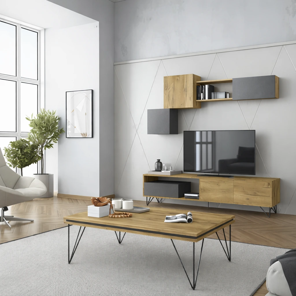 Τραπέζι σαλονιού από βακελίτη σε απόχρωση τεχνοτροπίας πέτρας με λεπτομέρεια σε φυσικό, και μεταλλικά πόδια σε απόχρωση γκρι ανοιχτό. Είναι διαθέσιμο και σε άλλους χρωματικούς συνδυασμούς.