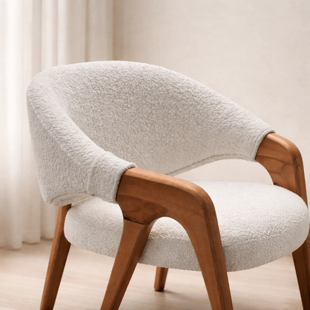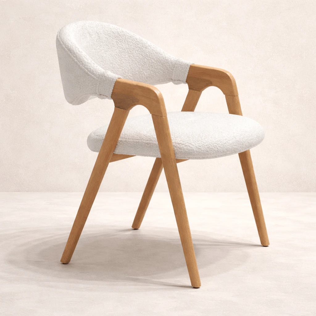 Η καρέκλα τραπεζαρίας συνδυάζει σύγχρονο design με υψηλή αισθητική, αποτελώντας ιδανική επιλογή για κάθε μοντέρνο χώρο. Το κάθισμα με επένδυση μπουκλέ προσφέρει μοναδική υφή και άνεση, ενώ τα ξύλινα πόδια σε φυσική απόχρωση δημιουργούν ένα ζεστό και κομψό αποτέλεσμα.