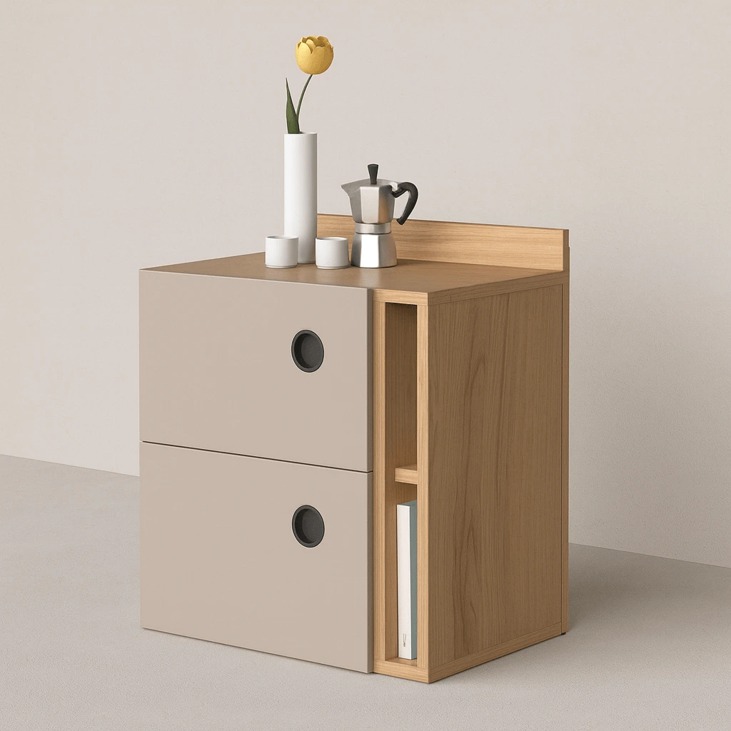 Αποτελείται από δύο πόρτες με πόμολο χωνευτό και δύο ράφια στο πλάι για την αποθήκευση βιβλίων και αντικειμένων.