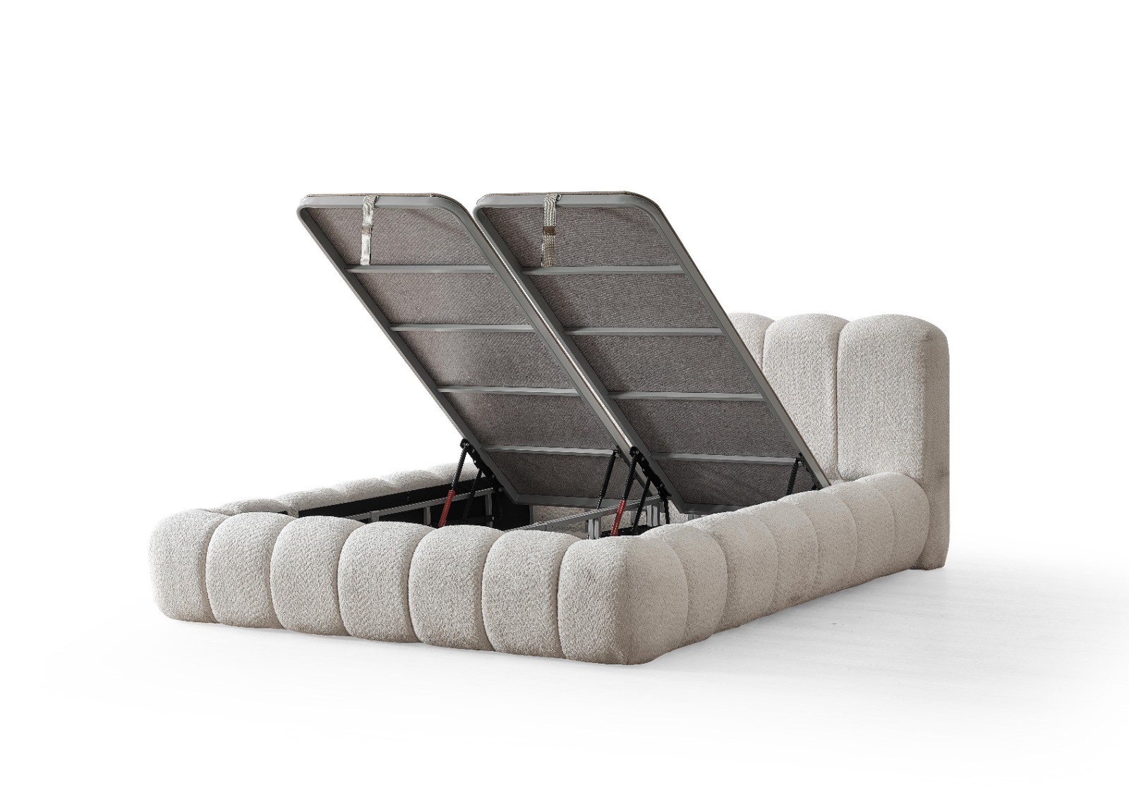 Το υφασμάτινο κρεβάτι AVVA ξεχωρίζει για τον σύγχρονο, καμπυλωτό σχεδιασμό του και την πλούσια υφή του. Επενδυμένο με υψηλής ποιότητας ύφασμα τύπου bouclé, προσφέρει μια αίσθηση πολυτέλειας και ζεστασιάς στον χώρο.
