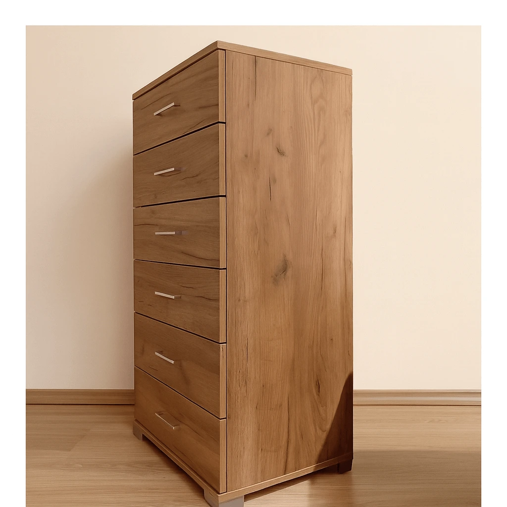 Μοντέρνα συρταριέρα σε απόχρωση φυσικού ξύλου, με έξι ευρύχωρα συρτάρια για άνετη αποθήκευση. Ο λιτός σχεδιασμός της συνδυάζεται αρμονικά με τα κομψά μεταλλικά χερούλια, προσφέροντας λειτουργικότητα και αισθητική σε κάθε υπνοδωμάτιο. Ιδανική επιλογή για όσους θέλουν να συνδυάσουν πρακτικότητα με διαχρονικό στυλ.