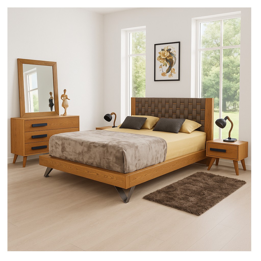 ΣΕΤ κρεβατοκάμαρας Καλυψώ, συλλογή Box Design. Κατασκευή από καπλαμά δρυ και μεταλλικά πόδια. Με ιδιαίτερα περίτεχνο και ψηλό κεφαλάρι. Δυνατότητα